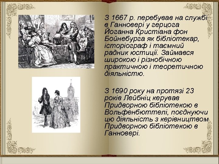 З 1667 р. перебував на службі в Ганновері у герцога Йоганна Кристіана фон Бойнебурга як бібліотекар, історіограф і таємний радник юстиції. Займався широкою і різнобічною практичною і теоретичною діяльністю. З 1690 року на протязі 23 років Лейбніц керував Придворною бібліотекою в Вольфенбюттелі, поєднуючи цю діяльність з керівництвом Придворною бібліотекою в Ганновері.