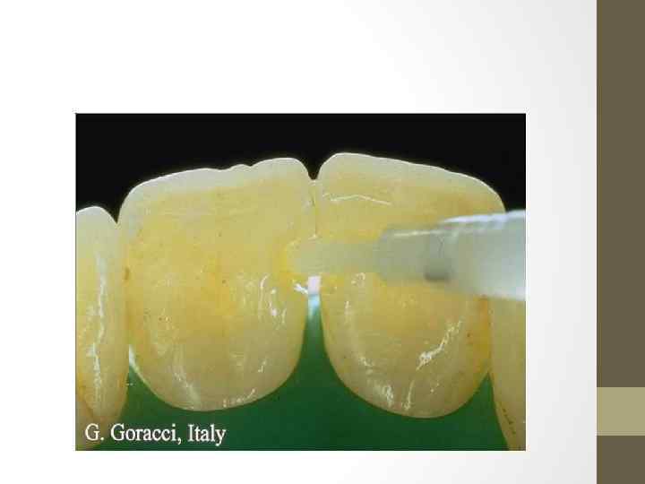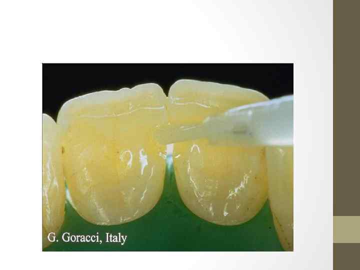 Субстраты адгезии • Эмаль зуба состоит из неорганического вещества (биологический апатит, около 95% по весу), органического компонента (коллагеновые волокна, 1 -1, 5%) и воды (4%). Благодаря этому эмаль можно высушить, что обеспечивает хорошую адгезию гидрофобного органического компонента композита. Для увеличения эффективности сцепления эмали и композита предусматривается предварительное кислотное протравливание эмали жидкостью или гелем на основе фосфорной (10 -37%) или малеиновой (10%) кислоты. В результате с поверхности эмали удаляется органический налет, денатурируются белки и формируется микропористость эмали за счет растворения участков эмалевых призм и веществ межпризменного пространства на глубину около 40 мкм.