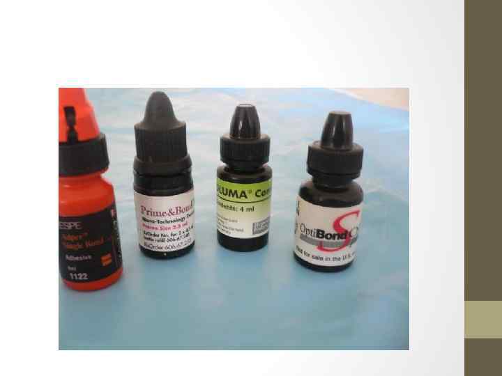 • представителями являются Prime & Bond 2. 0, Prime & Bond 2. 1 (Dentsply), One Step (Bisco), Single Bond (3 M), Optibond Solo (Kerr) и др. В некоторые из этих адгезивов дополнительно введены вещества, оказывающие противокариозное действие за счет выделения фтора, например, цетиламин гидрофлюорид в Prime & Bond 2. 1 (Dentsply).
