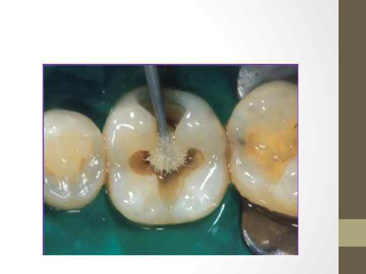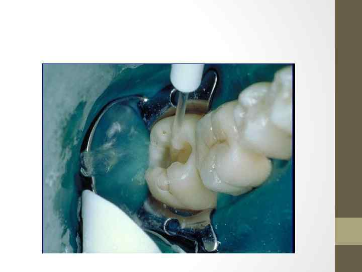 • 1 -й этап. Протравливание кариозной полости. На эмаль и дентин наносятся протравочный гель (ортофосфорная кислота) или протравочная жидкость (малеиновая кислота). Рекомендуемая экспозиция протравочного состава: на эмаль — 15 -30 секунд, на дентин — не более 15 секунд. После протравливания полость промывается водой и слегка просушивается воздухом. В результате проведения этого этапа эмаль становится микрошероховатой, смазанный слой на поверхности дентина растворяется и полностью удаляется, поверхностный дентин деминерализуется, раскрываются дентинные канальцы, обнажаются коллагеновые волокна.