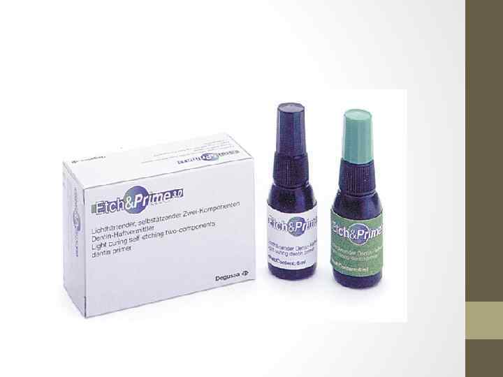 • В состав адгезивной системы входят, как правило, протравливающий компонент (протравка), праймер и бонд (адгезив).