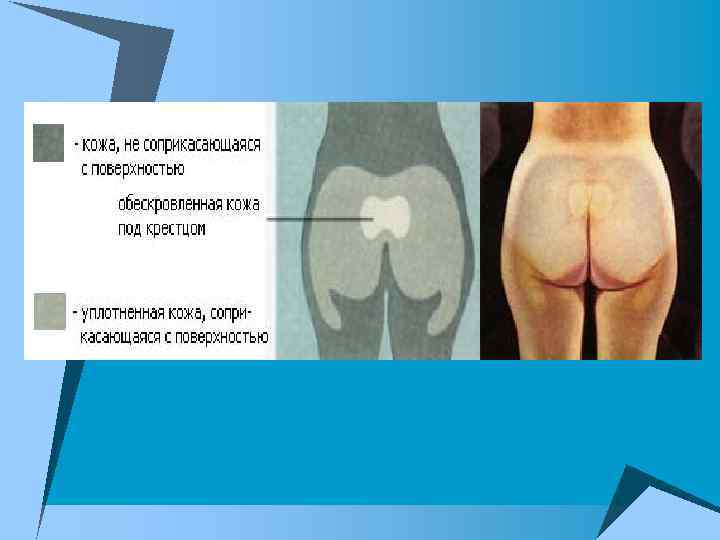 Пролежни могут образовываться везде, где есть костные выступы. Место образования пролежней зависит от положения больного: u в положении на спине: затылок, лопатки, локти, крестец, пятки; u в положении сидя: лопатки, седалищные бугры, стопы ног; u в положении на животе: ребра, гребни подвздошных костей, колени, пальцы ног с тыльной стороны; u в положении на боку: область тазобедренного сустава (область большого вертела).