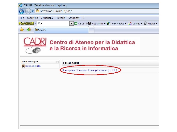 ECDL: test center • Gli esami previsti per l’acquisizione dell’ECDL devono essere sostenuti presso specifiche strutture denominate “Test Center” • Gli esami possono essere sostenuti presso una delle strutture del Test Center dell’Università degli Studi del Molise ubicate nelle sedi di Campobasso (II Edificio Polifunzionale), Pesche e Termoli • Il Test Center dell’Università degli Studi del Molise è gestito dal Centro di Ateneo per la Didattica e la Ricerca in Informatica (CADRI) Sito web: http: //www. cadri. unimol. it