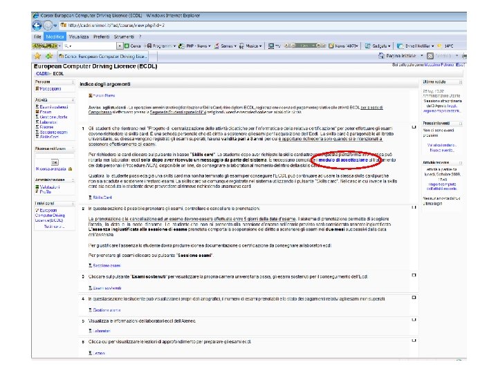 ECDL: esami • ATLAS: – Prima di iniziare l’esame il candidato deve scegliere … : • • Quale modulo desidera sostenere (fra l’elenco di moduli prenotati dal candidato) La versione del software (per esempio, Windows XP/Office 2003, Linux/Open. Office/Thunderbird e Firefox)