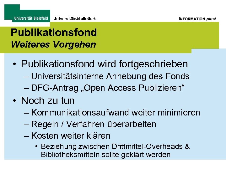 Universitätsbibliothek Publikationsfond Bedingungen • Erklärung über das Fehlen eigener Mittel (Nachwuchs!) • OA Publikation zwingend – „echte“ OA-Zeitschrift • o. k. – „hybride“ OA-Zeitschrift • nur wenn Refunding durch Ermäßigung der Abo-Kosten erfolgt – OA Buchpublikationen möglich • andere Formate, sofern fachlich erforderlich << http: //www. uni-bielefeld. de/ub/wp/publizieren. htm