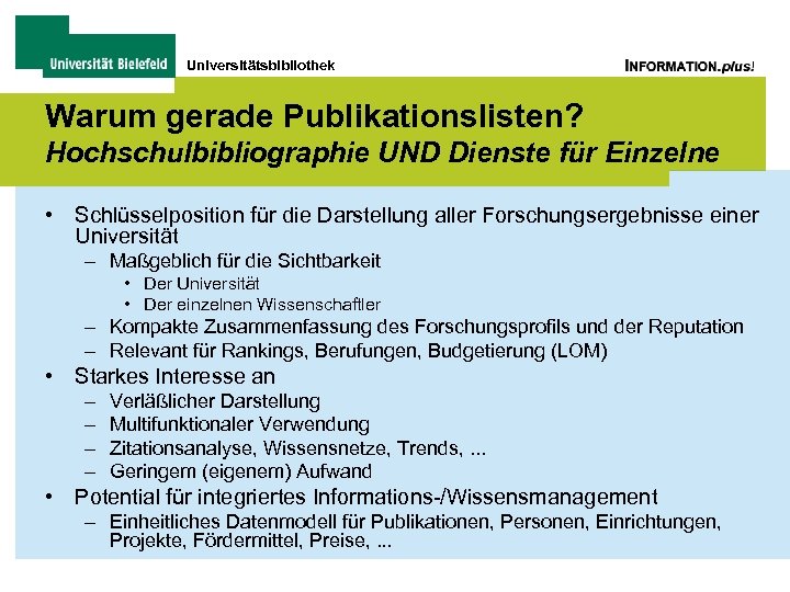 Universitätsbibliothek DFG-Projekt „Pub. Lister“ • Hochschulweiter, internetbasierter „Bibliographie-Service“ als Modellversuch – Internet-Publikationslisten möglichst vieler Forschender Uni Bielefeld auswerten – Umwandlung in einheitliches Format – Angebot neuer Services an Forschende – Testphase mit ca. 20 Professoren, dann uniweit – Integration mit • Forschungsdatenbank • Bi. Prints • Web-CMS • Förderung 2 Jahre, 2 Stellen (davon 1 aus UB)