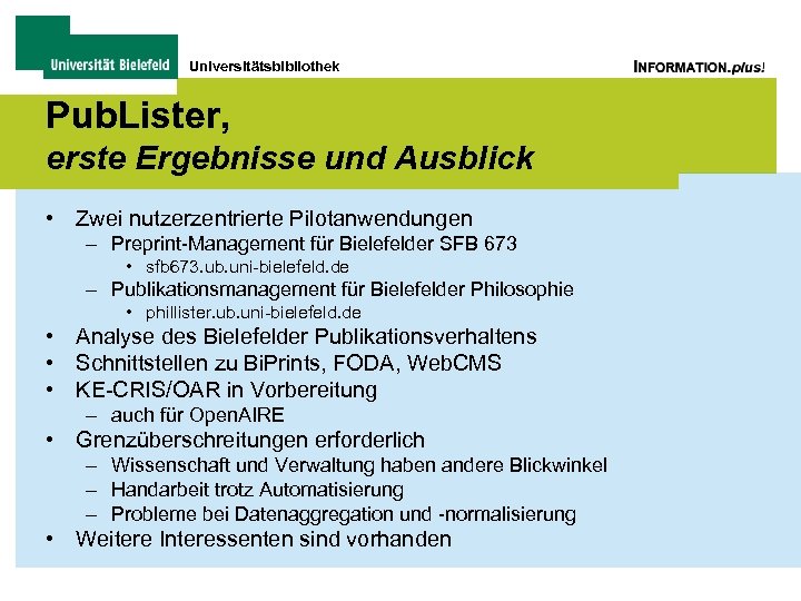 Universitätsbibliothek Pub. Lister, erste Ergebnisse und Ausblick • Zwei nutzerzentrierte Pilotanwendungen – Preprint-Management für Bielefelder SFB 673 • sfb 673. ub. uni-bielefeld. de – Publikationsmanagement für Bielefelder Philosophie • phillister. ub. uni-bielefeld. de • Analyse des Bielefelder Publikationsverhaltens • Schnittstellen zu Bi. Prints, FODA, Web. CMS • KE-CRIS/OAR in Vorbereitung – auch für Open. AIRE • Grenzüberschreitungen erforderlich – Wissenschaft und Verwaltung haben andere Blickwinkel – Handarbeit trotz Automatisierung – Probleme bei Datenaggregation und -normalisierung • Weitere Interessenten sind vorhanden