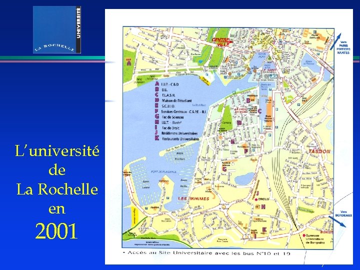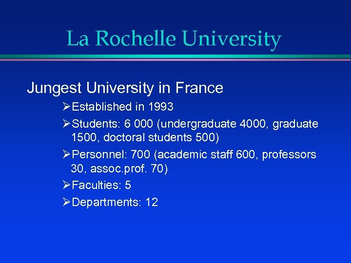 La Rochelle University Jungest University in France ØEstablished in 1993 ØStudents: 6 000 (undergraduate 4000, graduate 1500, doctoral students 500) ØPersonnel: 700 (academic staff 600, professors 30, assoc. prof. 70) ØFaculties: 5 ØDepartments: 12