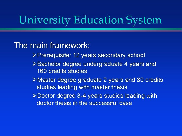 University Education System The main framework: ØPrerequisite: 12 years secondary school ØBachelor degree undergraduate 4 years and 160 credits studies ØMaster degree graduate 2 years and 80 credits studies leading with master thesis ØDoctor degree 3 -4 years studies leading with doctor thesis in the successful case