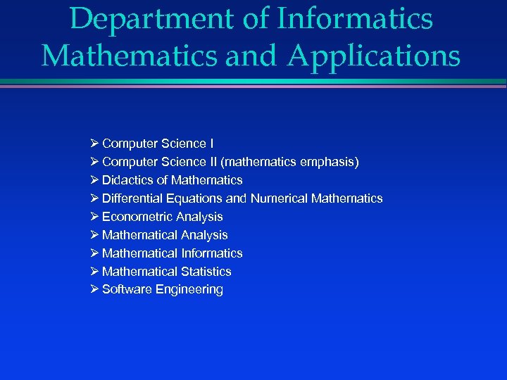 Department of Informatics Mathematics and Applications Ø Computer Science II (mathematics emphasis) Ø Didactics of Mathematics Ø Differential Equations and Numerical Mathematics Ø Econometric Analysis Ø Mathematical Informatics Ø Mathematical Statistics Ø Software Engineering