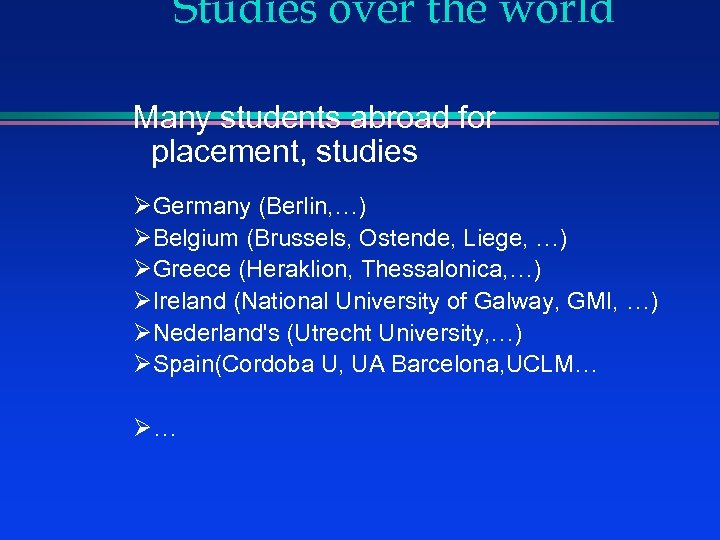 Studies over the world Many students abroad for placement, studies ØGermany (Berlin, …) ØBelgium (Brussels, Ostende, Liege, …) ØGreece (Heraklion, Thessalonica, …) ØIreland (National University of Galway, GMI, …) ØNederland's (Utrecht University, …) ØSpain(Cordoba U, UA Barcelona, UCLM… Ø…