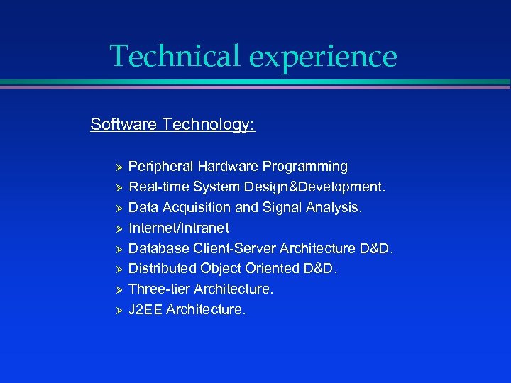 Technical experience Software Technology: Ø Ø Ø Ø Peripheral Hardware Programming Real-time System Design&Development. Data Acquisition and Signal Analysis. Internet/Intranet Database Client-Server Architecture D&D. Distributed Object Oriented D&D. Three-tier Architecture. J 2 EE Architecture.