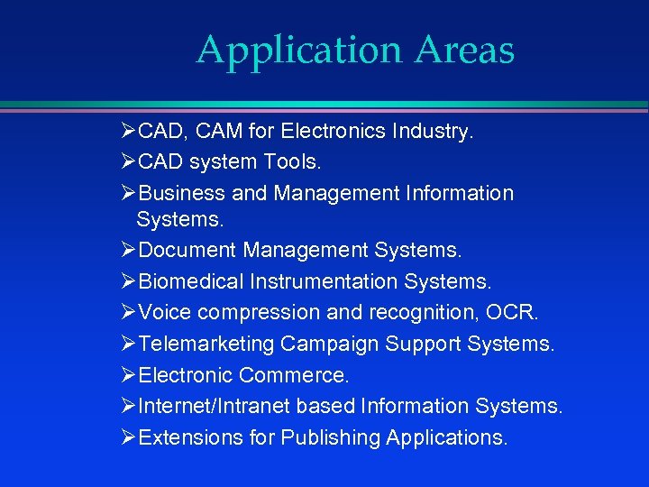 Application Areas ØCAD, CAM for Electronics Industry. ØCAD system Tools. ØBusiness and Management Information Systems. ØDocument Management Systems. ØBiomedical Instrumentation Systems. ØVoice compression and recognition, OCR. ØTelemarketing Campaign Support Systems. ØElectronic Commerce. ØInternet/Intranet based Information Systems. ØExtensions for Publishing Applications.