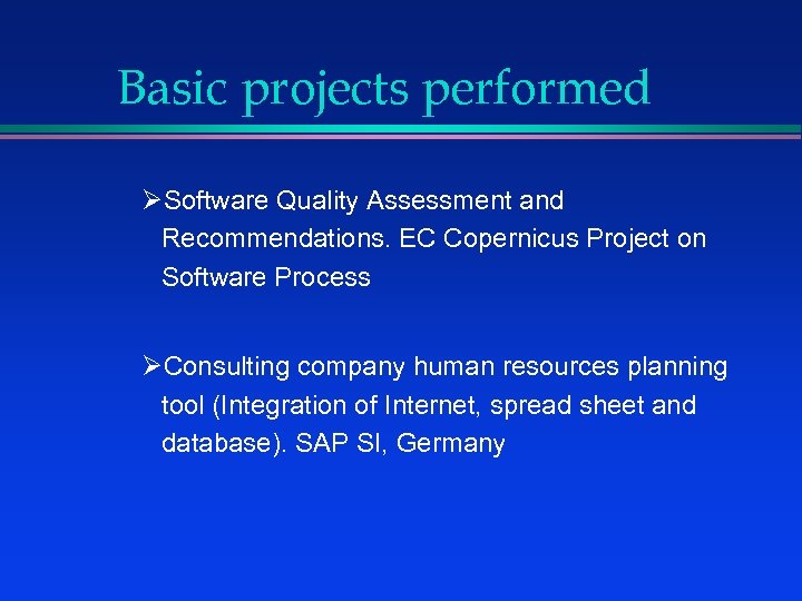 Basic projects performed ØSoftware Quality Assessment and Recommendations. EC Copernicus Project on Software Process ØConsulting company human resources planning tool (Integration of Internet, spread sheet and database). SAP SI, Germany