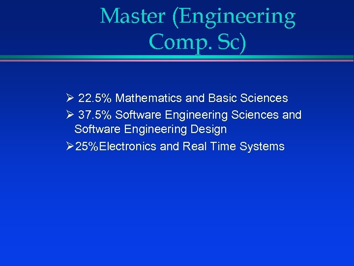 Master (Engineering Comp. Sc) Ø 22. 5% Mathematics and Basic Sciences Ø 37. 5% Software Engineering Sciences and Software Engineering Design Ø 25%Electronics and Real Time Systems