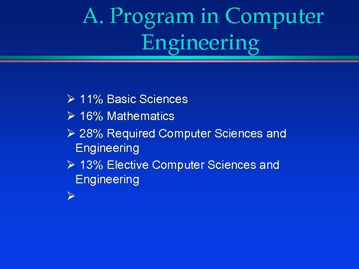 A. Program in Computer Engineering Ø 11% Basic Sciences Ø 16% Mathematics Ø 28% Required Computer Sciences and Engineering Ø 13% Elective Computer Sciences and Engineering Ø