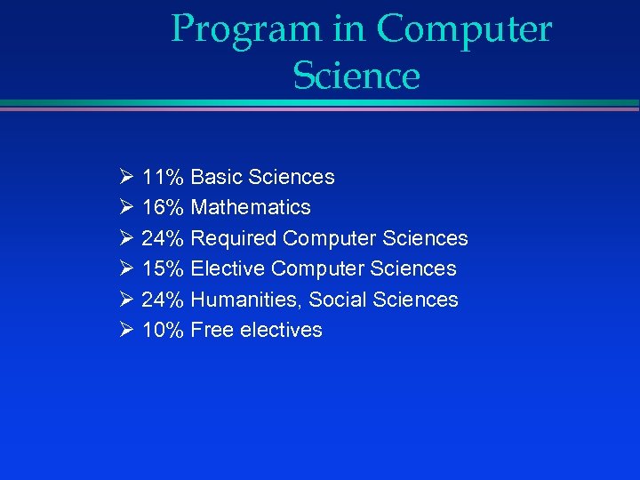 Program in Computer Science Ø 11% Basic Sciences Ø 16% Mathematics Ø 24% Required Computer Sciences Ø 15% Elective Computer Sciences Ø 24% Humanities, Social Sciences Ø 10% Free electives
