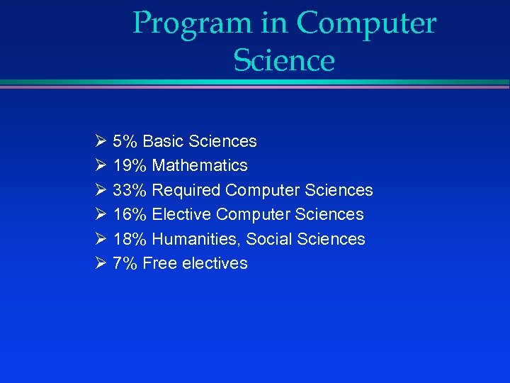 Program in Computer Science Ø 5% Basic Sciences Ø 19% Mathematics Ø 33% Required Computer Sciences Ø 16% Elective Computer Sciences Ø 18% Humanities, Social Sciences Ø 7% Free electives