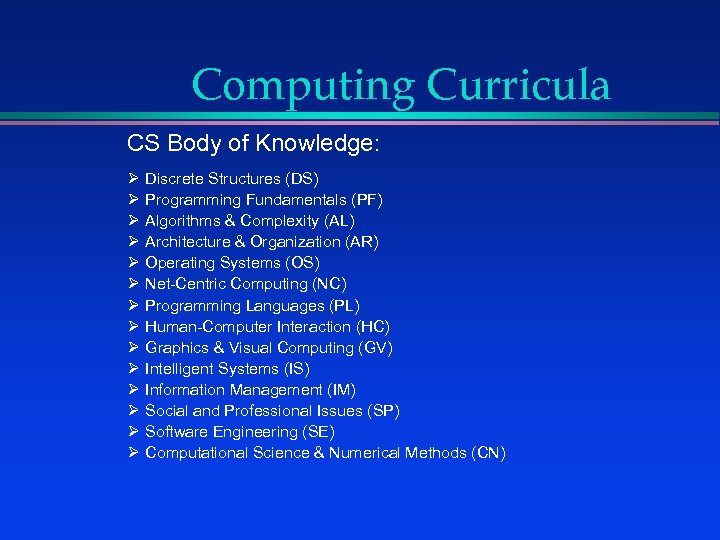 Computing Curricula CS Body of Knowledge: Ø Discrete Structures (DS) Ø Programming Fundamentals (PF) Ø Algorithms & Complexity (AL) Ø Architecture & Organization (AR) Ø Operating Systems (OS) Ø Net-Centric Computing (NC) Ø Programming Languages (PL) Ø Human-Computer Interaction (HC) Ø Graphics & Visual Computing (GV) Ø Intelligent Systems (IS) Ø Information Management (IM) Ø Social and Professional Issues (SP) Ø Software Engineering (SE) Ø Computational Science & Numerical Methods (CN)