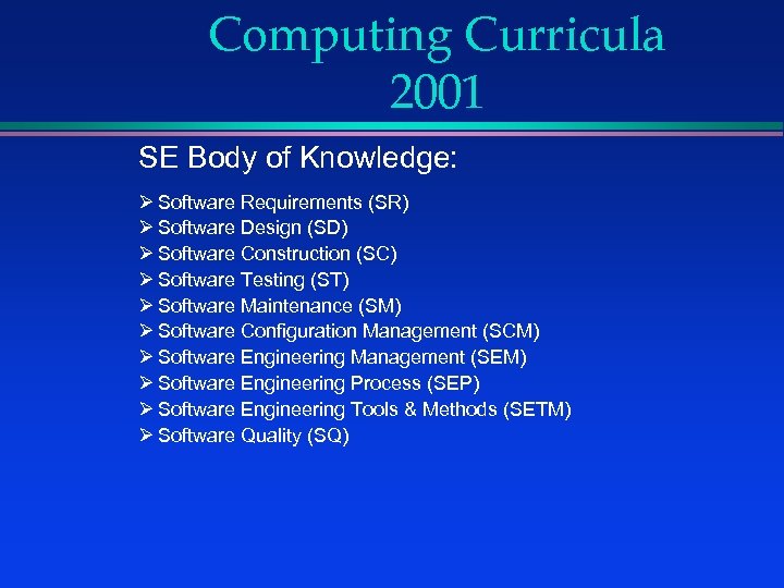 Computing Curricula 2001 SE Body of Knowledge: Ø Software Requirements (SR) Ø Software Design (SD) Ø Software Construction (SC) Ø Software Testing (ST) Ø Software Maintenance (SM) Ø Software Configuration Management (SCM) Ø Software Engineering Management (SEM) Ø Software Engineering Process (SEP) Ø Software Engineering Tools & Methods (SETM) Ø Software Quality (SQ)