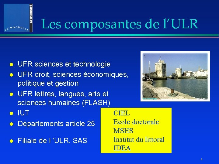 Les composantes de l’ULR l l l UFR sciences et technologie UFR droit, sciences économiques, politique et gestion UFR lettres, langues, arts et sciences humaines (FLASH) IUT CIEL Ecole doctorale Départements article 25 MSHS Institut du littoral Filiale de l ’ULR. SAS IDEA 3