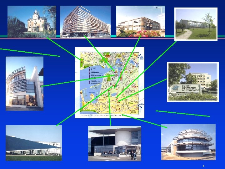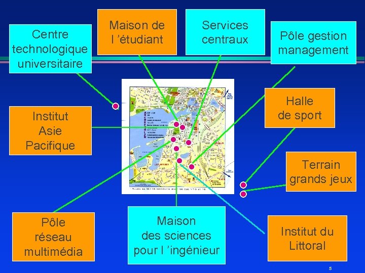 Centre technologique universitaire Maison de l ’étudiant Services centraux Pôle gestion management Halle de sport Institut Asie Pacifique Terrain grands jeux Pôle réseau multimédia Maison des sciences pour l ’ingénieur Institut du Littoral 5