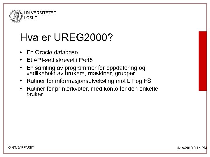 UNIVERSITETET I OSLO Hva er UREG 2000? • En Oracle database • Et API-sett skrevet i Perl 5 • En samling av programmer for oppdatering og vedlikehold av brukere, maskiner, grupper • Rutiner for informasjonsutveksling mot LT og FS • Rutiner for printerkvoter, med konto for den enkelte bruker. © GT/SAPP/USIT 3/15/2018 8: 15 PM