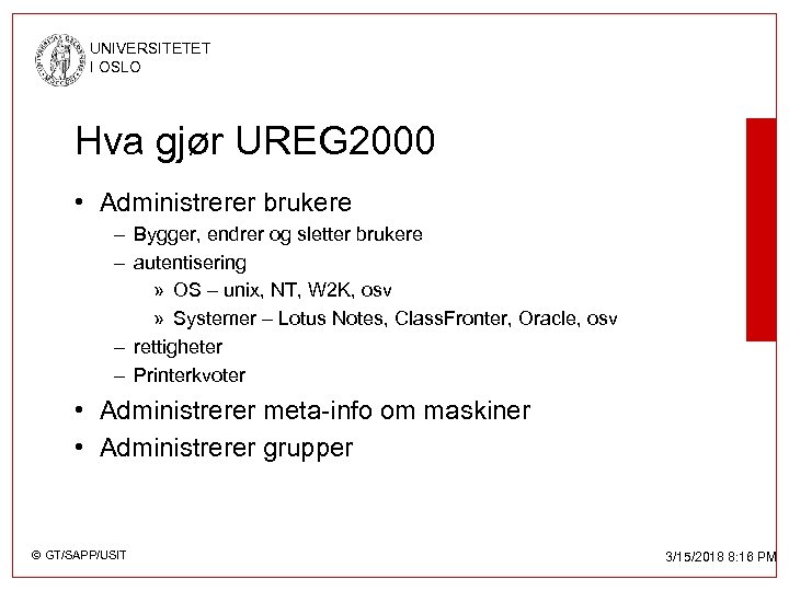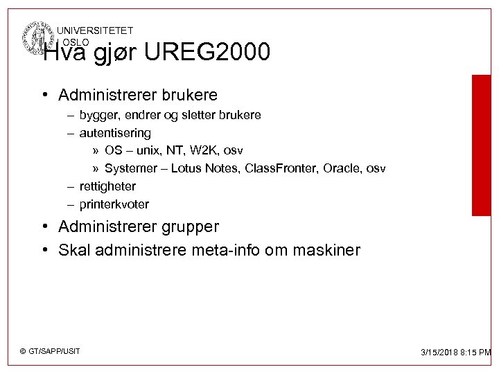 UNIVERSITETET I OSLO Hva gjør UREG 2000 • Administrerer brukere – Bygger, endrer og sletter brukere – autentisering » OS – unix, NT, W 2 K, osv » Systemer – Lotus Notes, Class. Fronter, Oracle, osv – rettigheter – Printerkvoter • Administrerer meta-info om maskiner • Administrerer grupper © GT/SAPP/USIT 3/15/2018 8: 16 PM