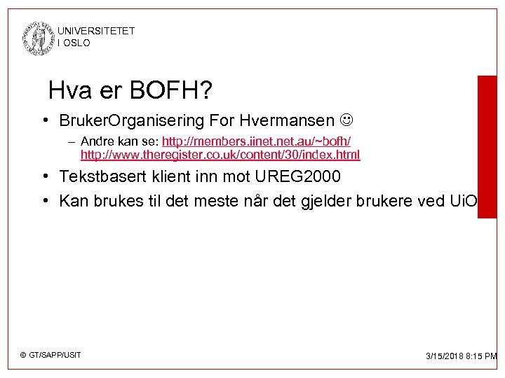 UNIVERSITETET I OSLO Hva er BOFH? • Bruker. Organisering For Hvermansen – Andre kan se: http: //members. iinet. au/~bofh/ http: //www. theregister. co. uk/content/30/index. html • Tekstbasert klient inn mot UREG 2000 • Kan brukes til det meste når det gjelder brukere ved Ui. O © GT/SAPP/USIT 3/15/2018 8: 15 PM