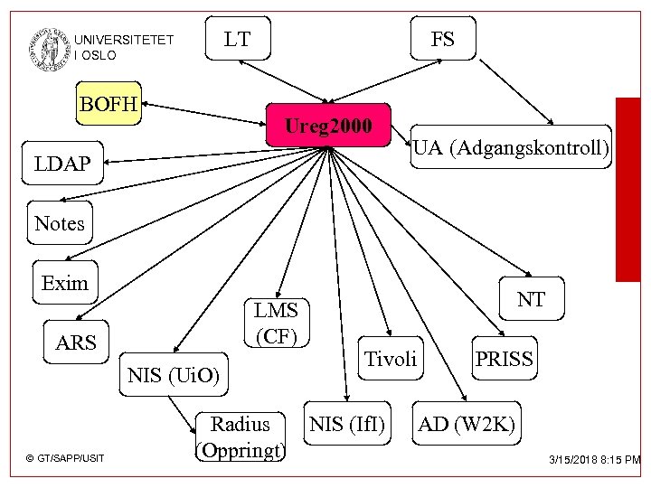LT UNIVERSITETET I OSLO BOFH FS Ureg 2000 LDAP UA (Adgangskontroll) Notes Exim LMS (CF) ARS NIS (Ui. O) © GT/SAPP/USIT Radius (Oppringt) NT Tivoli NIS (If. I) PRISS AD (W 2 K) 3/15/2018 8: 15 PM