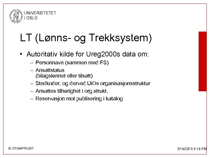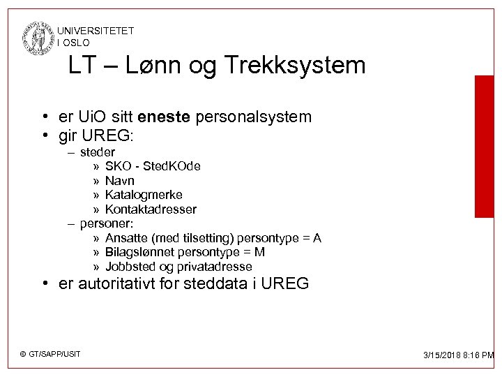 UNIVERSITETET I OSLO LT – Lønn og Trekksystem • Er Ui. O sitt eneste personalsystem • Gir UREG: – Steder » SKO - Sted. KOden » Navn » Katalogmerke » Kontaktadresser – Personer (Ansatte Type = ’A’ og Bilagslønnet Type = ’M’) » Faste ansatte og bilagslønnet » Jobbsted og privatadresse • Er autoritativt, dvs. Skriver over sted- og personer-data i UREG © GT/SAPP/USIT 3/15/2018 8: 16 PM