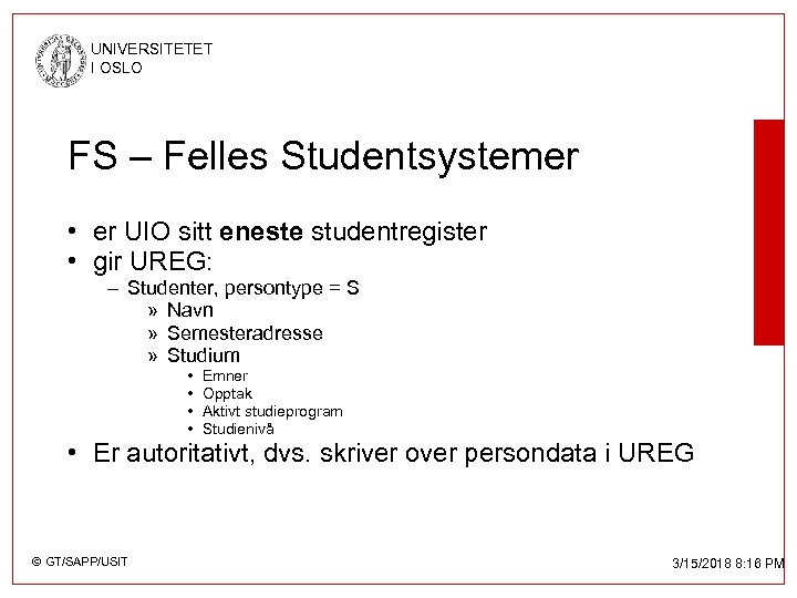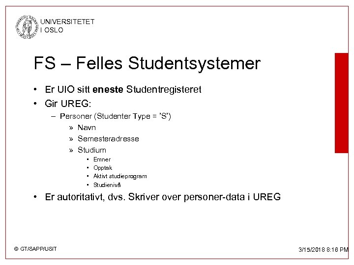 UNIVERSITETET I OSLO FS – Felles Studentsystemer • er UIO sitt eneste studentregister • gir UREG: – Studenter, persontype = S » Navn » Semesteradresse » Studium • • Emner Opptak Aktivt studieprogram Studienivå • Er autoritativt, dvs. skriver over persondata i UREG © GT/SAPP/USIT 3/15/2018 8: 16 PM