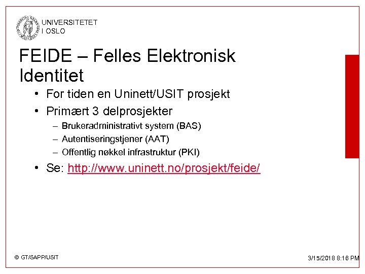 UNIVERSITETET I OSLO FEIDE – Felles Elektronisk Identitet • For tiden en Uninett/USIT prosjekt • Primært 3 delprosjekter – Brukeradministrativt system (BAS) – Autentiseringstjener (AAT) – Offentlig nøkkel infrastruktur (PKI) • Se: http: //www. uninett. no/prosjekt/feide/ © GT/SAPP/USIT 3/15/2018 8: 16 PM