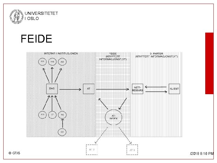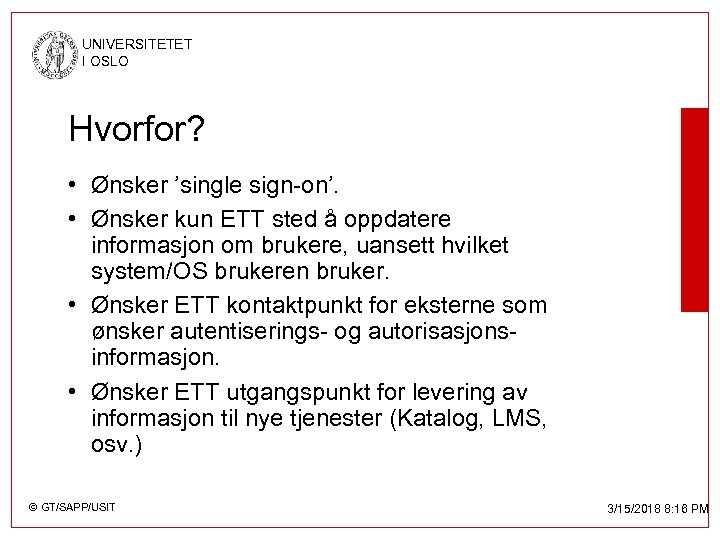 UNIVERSITETET I OSLO Hvorfor? • Ønsker ’single sign-on’. • Ønsker kun ETT sted å oppdatere informasjon om brukere, uansett hvilket system/OS brukeren bruker. • Ønsker ETT kontaktpunkt for eksterne som ønsker autentiserings- og autorisasjonsinformasjon. • Ønsker ETT utgangspunkt for levering av informasjon til nye tjenester (Katalog, LMS, osv. ) © GT/SAPP/USIT 3/15/2018 8: 16 PM