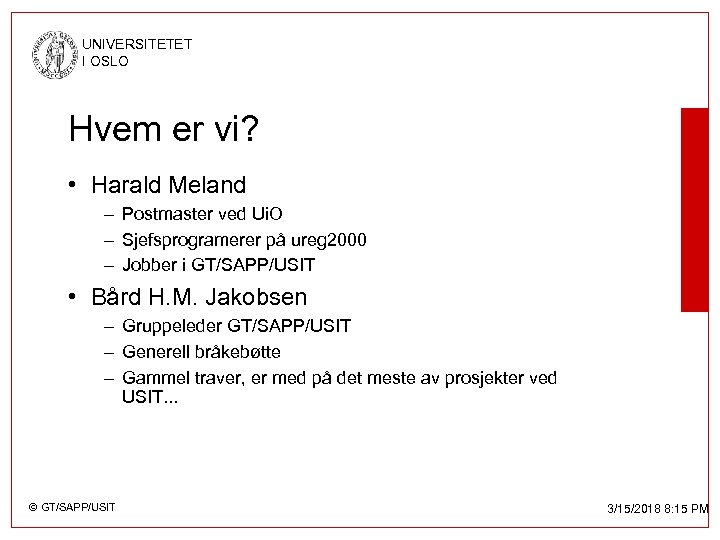 UNIVERSITETET I OSLO Hvem er vi? • Harald Meland – Postmaster ved Ui. O – Sjefsprogramerer på ureg 2000 – Jobber i GT/SAPP/USIT • Bård H. M. Jakobsen – Gruppeleder GT/SAPP/USIT – Generell bråkebøtte – Gammel traver, er med på det meste av prosjekter ved USIT. . . © GT/SAPP/USIT 3/15/2018 8: 15 PM