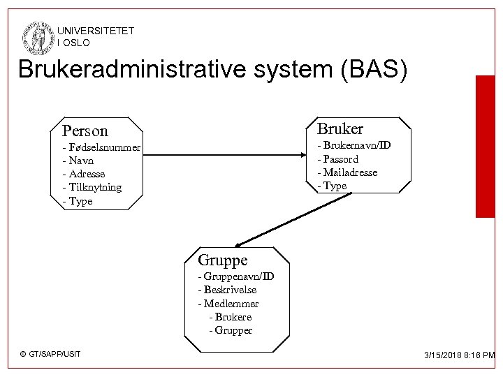 UNIVERSITETET I OSLO Hva er et Brukeradministrative system (BAS) Person Bruker - Fødselsnummer - Navn - Adresse - Tilknytning - Type - Brukernavn/ID - Passord - E-post adresse - Type Gruppe - Gruppenavn/ID - Beskrivelse - Medlemmer - Brukere - Grupper © GT/SAPP/USIT 3/15/2018 8: 15 PM