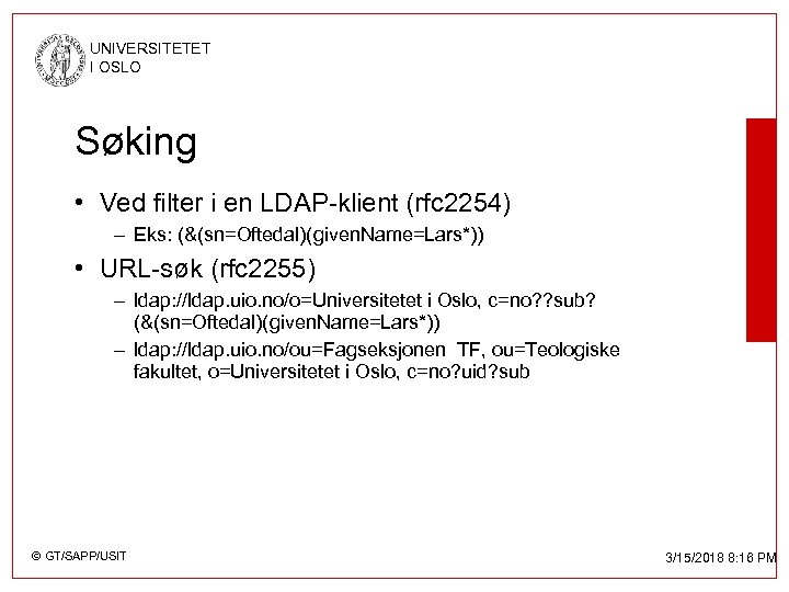 UNIVERSITETET I OSLO Søking • Ved filter i en LDAP-klient (rfc 2254) – Eks: (&(sn=Oftedal)(given. Name=Lars*)) • URL-søk (rfc 2255) – ldap: //ldap. uio. no/o=Universitetet i Oslo, c=no? ? sub? (&(sn=Oftedal)(given. Name=Lars*)) – ldap: //ldap. uio. no/ou=Fagseksjonen TF, ou=Teologiske fakultet, o=Universitetet i Oslo, c=no? uid? sub © GT/SAPP/USIT 3/15/2018 8: 16 PM