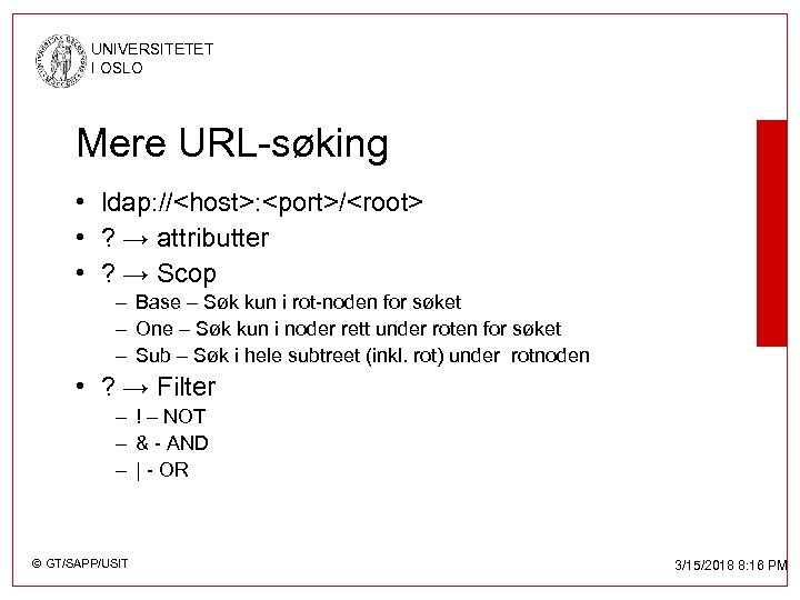 UNIVERSITETET I OSLO Mere URL-søking • ldap: //<host>: <port>/<root> • ? → attributter • ? → Scop – Base – Søk kun i rot-noden for søket – One – Søk kun i noder rett under roten for søket – Sub – Søk i hele subtreet (inkl. rot) under rotnoden • ? → Filter – ! – NOT – & - AND – | - OR © GT/SAPP/USIT 3/15/2018 8: 16 PM