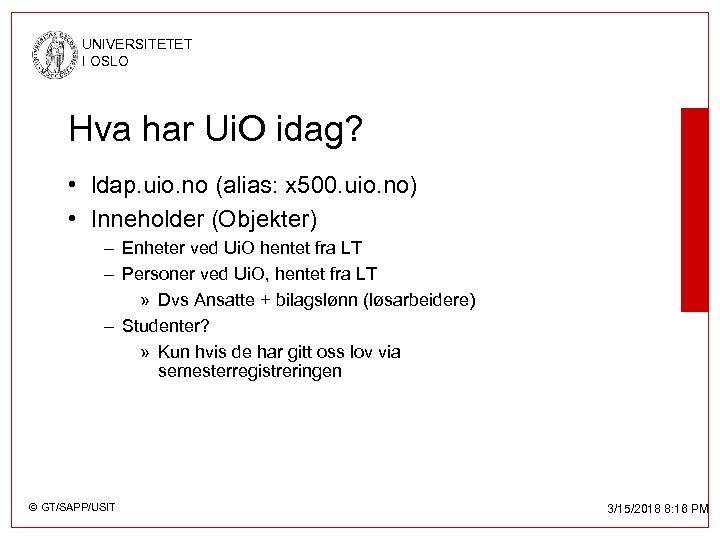 UNIVERSITETET I OSLO LDAP • Kjører i dag Open. LDAP • Krever aktivt/passivt samtykke for å være med. • Bruker et skjema som er egenutviklet, skal over til et subclasse av edu. Person (http: //www. educause. edu/eduperson/) © GT/SAPP/USIT 3/15/2018 8: 16 PM