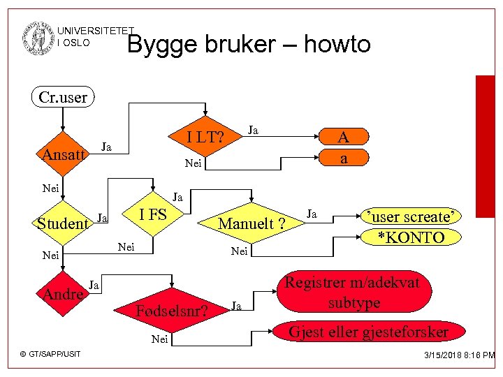 UNIVERSITETET I OSLO Bygge bruker – howto Cr. user Ja Ansatt Ja I FS Ja Nei Andre Manuelt ? Nei Ja Fødselsnr? Nei © GT/SAPP/USIT A a Nei Student Ja I LT? Ja Ja ’user screate’ *KONTO Registrer m/adekvat subtype Gjest eller gjesteforsker 3/15/2018 8: 16 PM