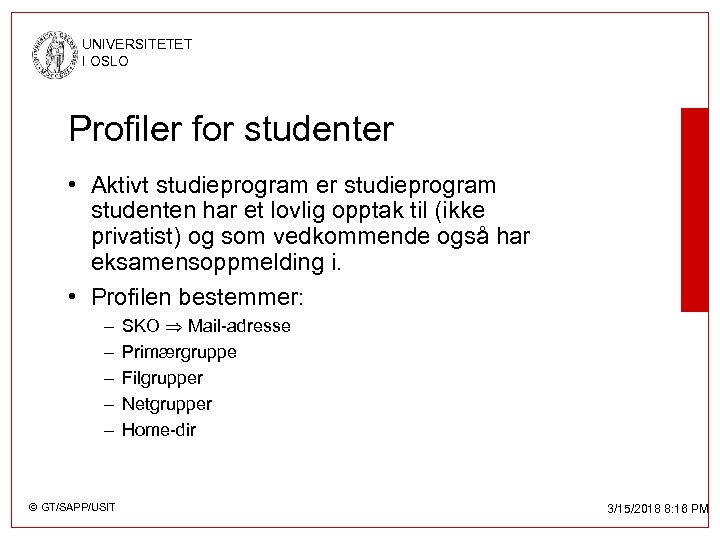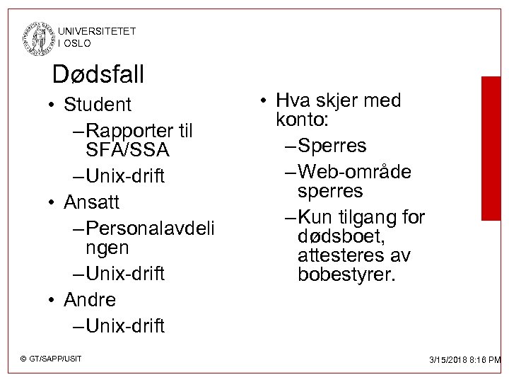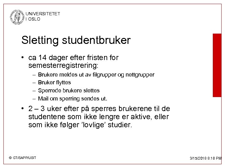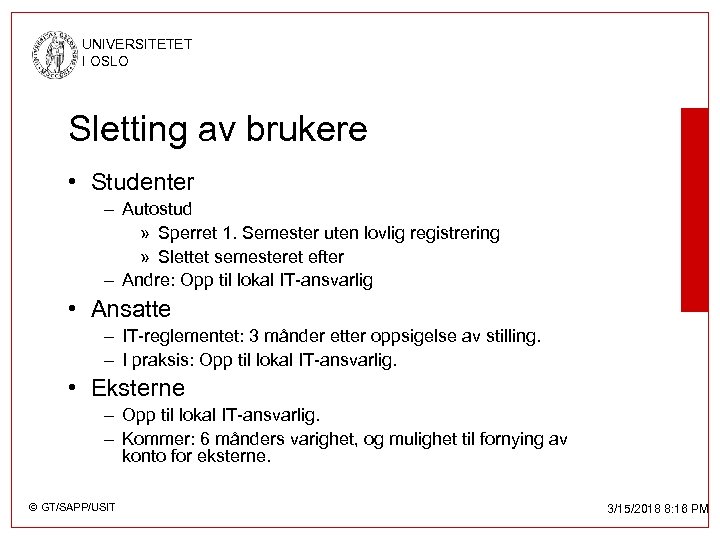 UNIVERSITETET I OSLO Sletting av brukere • Studenter – Autostud » Sperret 1. Semester uten lovlig registrering » Slettet semesteret efter – Andre: Opp til lokal IT-ansvarlig • Ansatte – IT-reglementet: 3 månder etter oppsigelse av stilling. – I praksis: Opp til lokal IT-ansvarlig. • Eksterne – Opp til lokal IT-ansvarlig. – Kommer: 6 månders varighet, og mulighet til fornying av konto for eksterne. © GT/SAPP/USIT 3/15/2018 8: 16 PM