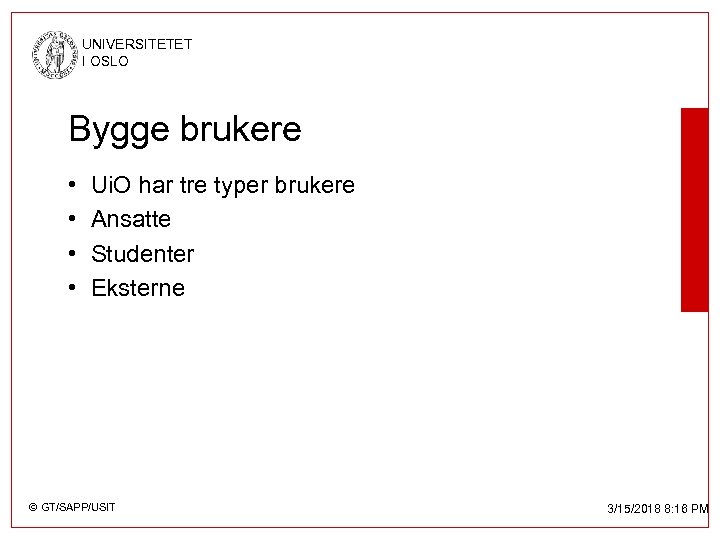 UNIVERSITETET I OSLO Bygge brukere • • Ui. O har tre typer brukere Ansatte Studenter Eksterne © GT/SAPP/USIT 3/15/2018 8: 16 PM