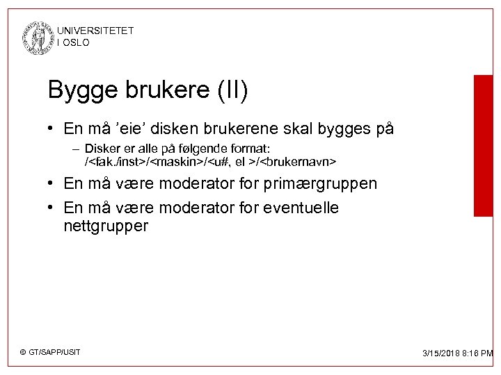 UNIVERSITETET I OSLO Bygge brukere (II) • En må ’eie’ disken brukerene skal bygges på – Disker er alle på følgende format: /<fak. /inst>/<maskin>/<u#, el >/<brukernavn> • En må være moderator for primærgruppen • En må være moderator for eventuelle nettgrupper © GT/SAPP/USIT 3/15/2018 8: 16 PM