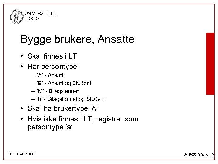 UNIVERSITETET I OSLO Bygge brukere, Ansatte • Skal finnes i LT • Har persontype: – – ’A’ - Ansatt ’B’ - Ansatt og Student ’M’ - Bilagslønnet ’b’ - Bilagslønnet og Student • Skal ha brukertype ’A’ • Hvis ikke finnes i LT, registrer som persontype ’a’ © GT/SAPP/USIT 3/15/2018 8: 16 PM