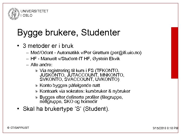 UNIVERSITETET I OSLO Bygge brukere, Studenter • 3 metoder er i bruk – Med/Odont - Automatikk v/Per Grøttum (per@ifi. uio. no) – HF - Manuelt v/Student-IT HF, Øystein Ekvik – Alle andre: » Via registrering til kurs i FS (TFKONTO, JUSKONTO, JUTACCOUNT, MNKONTO, SVACCOUNT, UVKONTO) » Konto bygges påfølgende natt » Kontoark via sokrates: kursbruker & nybruker » Bygges efter definerte profiler (filegruppe, nettgruppe, SKO og homedir • Skal ha brukertype ’S’ (Student). © GT/SAPP/USIT 3/15/2018 8: 16 PM
