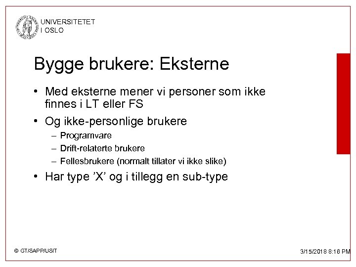 UNIVERSITETET I OSLO Bygge brukere: Eksterne • Med eksterne mener vi personer som ikke finnes i LT eller FS • Og ikke-personlige brukere – Programvare – Drift-relaterte brukere – Fellesbrukere (normalt tillater vi ikke slike) • Har type ’X’ og i tillegg en sub-type © GT/SAPP/USIT 3/15/2018 8: 16 PM