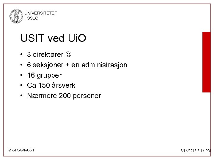UNIVERSITETET I OSLO USIT ved Ui. O • • • 3 direktører 6 seksjoner + en administrasjon 16 grupper Ca 150 årsverk Nærmere 200 personer © GT/SAPP/USIT 3/15/2018 8: 15 PM