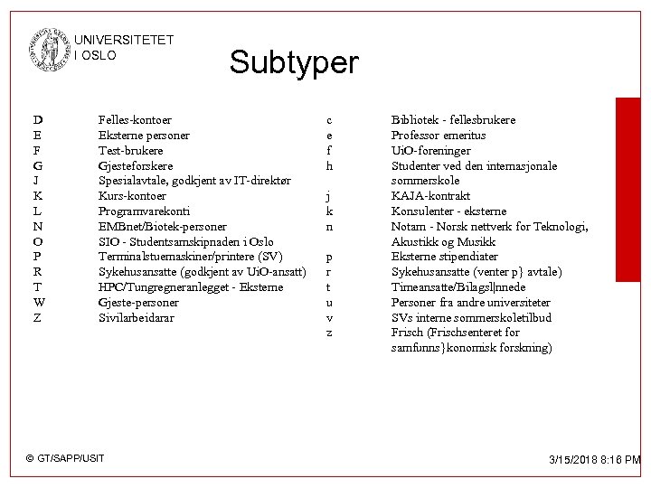 UNIVERSITETET I OSLO D E F G J K L N O P R T W Z Subtyper Felles-kontoer Eksterne personer Test-brukere Gjesteforskere Spesialavtale, godkjent av IT-direktør Kurs-kontoer Programvarekonti EMBnet/Biotek-personer SIO - Studentsamskipnaden i Oslo Terminalstuemaskiner/printere (SV) Sykehusansatte (godkjent av Ui. O-ansatt) HPC/Tungregneranlegget - Eksterne Gjeste-personer Sivilarbeidarar © GT/SAPP/USIT c e f h j k n p r t u v z Bibliotek - fellesbrukere Professor emeritus Ui. O-foreninger Studenter ved den internasjonale sommerskole KAJA-kontrakt Konsulenter - eksterne Notam - Norsk nettverk for Teknologi, Akustikk og Musikk Eksterne stipendiater Sykehusansatte (venter p} avtale) Timeansatte/Bilagsl|nnede Personer fra andre universiteter SVs interne sommerskoletilbud Frisch (Frischsenteret for samfunns}konomisk forskning) 3/15/2018 8: 16 PM