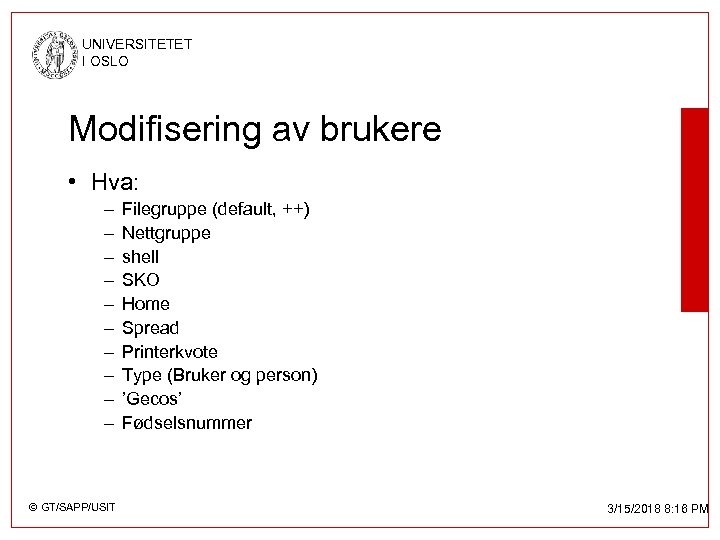 UNIVERSITETET I OSLO Modifisering av brukere • Hva: – – – – – © GT/SAPP/USIT Filegruppe (default, ++) Nettgruppe shell SKO Home Spread Printerkvote Type (Bruker og person) ’Gecos’ Fødselsnummer 3/15/2018 8: 16 PM