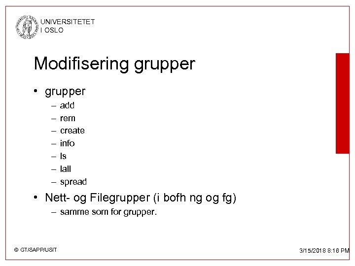 UNIVERSITETET I OSLO Modifisering grupper • grupper – – – – add rem create info ls lall spread • Nett- og Filegrupper (i bofh ng og fg) – samme som for grupper. © GT/SAPP/USIT 3/15/2018 8: 16 PM